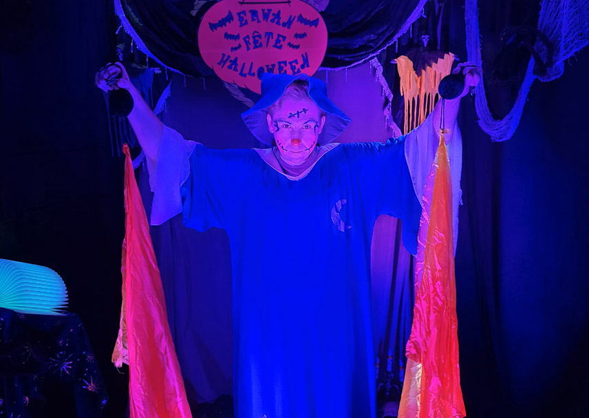 Pour Halloween, Erwan rêve de devenir un grand sorcier... mais il reste un clown ! Avec l’aide du public, il enchaîne jonglerie, bulles magiques, cloches ensorcelées et humour pour tenter de réaliser son vœu dans un spectacle drôle et interactif.